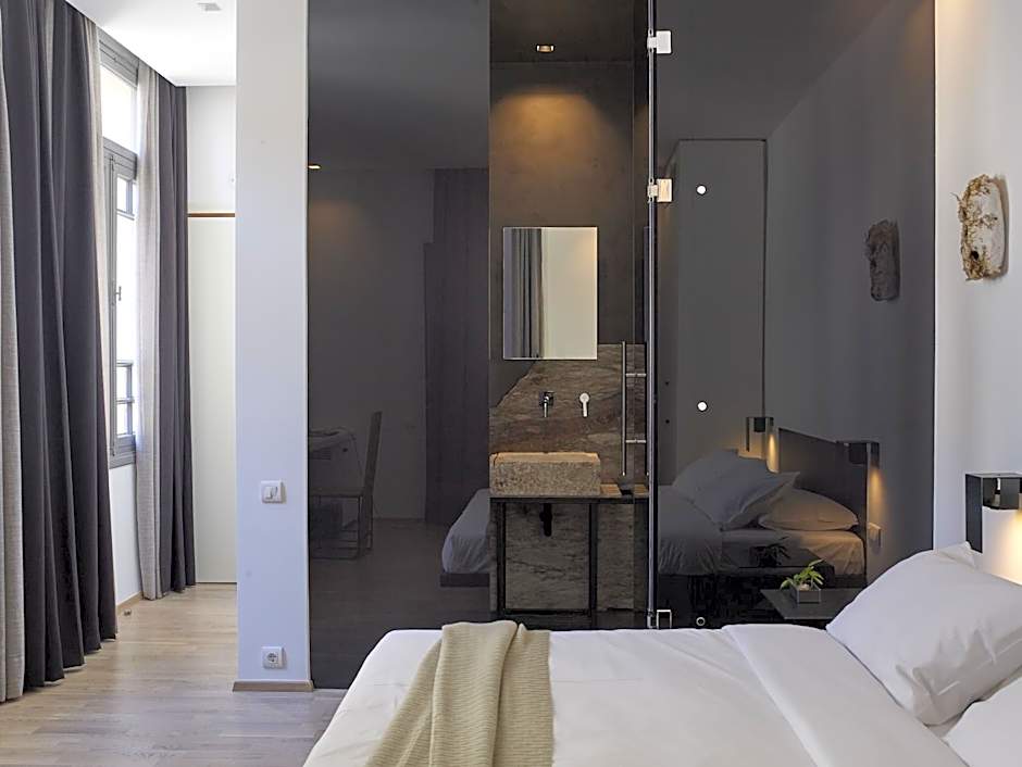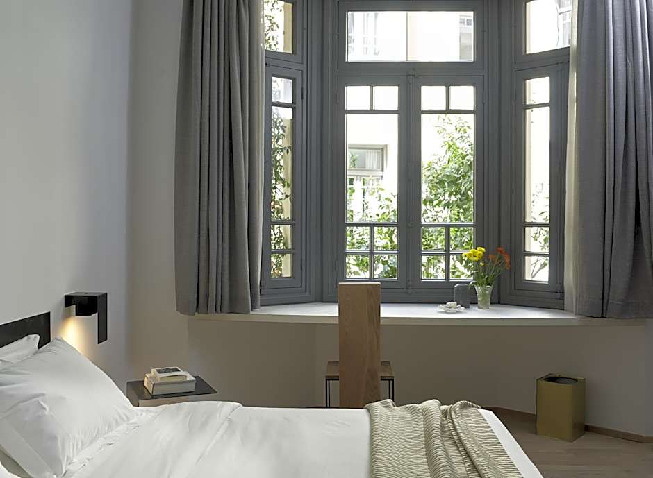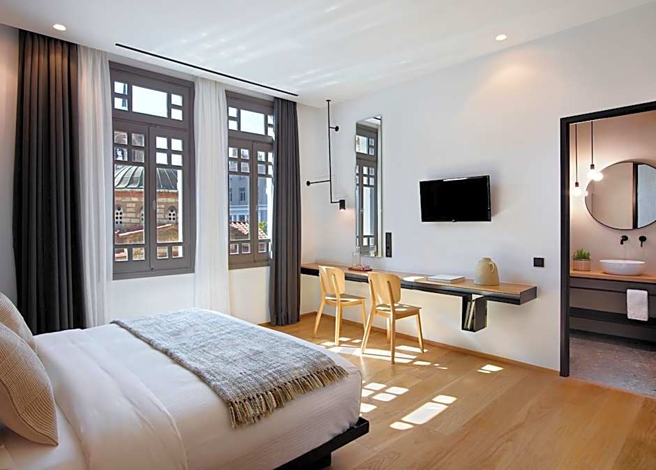 Modernly decorated room with Cocomat mattress and linens, equipped with a satellite, flat-screen TV and free WiFi. The bathroom features marble details and is stocked with Olive amenities.